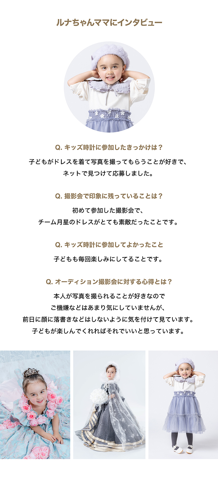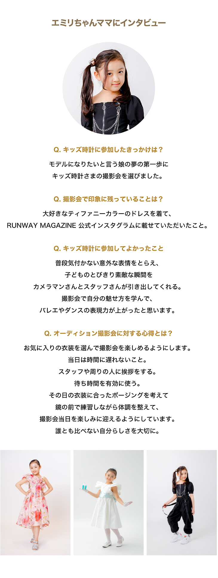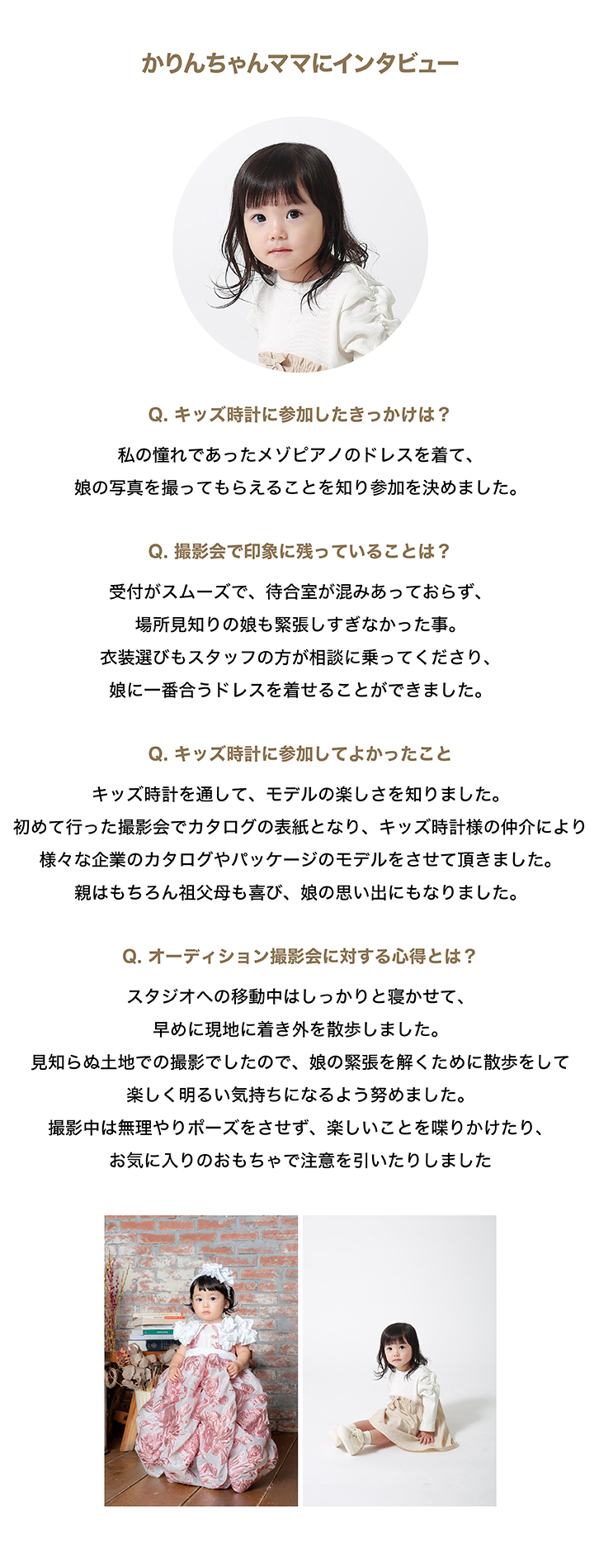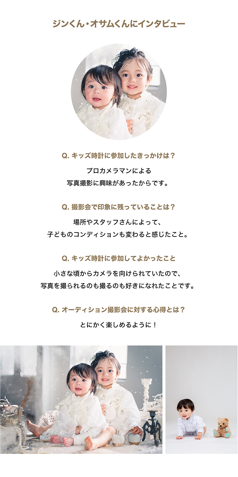 | お願いと注意事項 | ※オーディション撮影はお1組 約5分間です。 (ただし、モデルさんの状況によって撮影時間が変動し、撮影順をお待ちいただく時間が長くなることがございます) ※撮影会受付以降、終了までは個人のスマホやカメラでの撮影(静止画・動画ともに)はご遠慮ください。 ※白背景紙で撮影を行いますので、撮影用の靴のご用意をお願いいたします。 (まだ靴を履かない月齢のモデルさんは靴下での撮影も可能です) ※キッズ時計スタッフの指示に従っていただけない場合、該当のモデルさんのオーディションの中止や退場をお願いする場合があります。 |